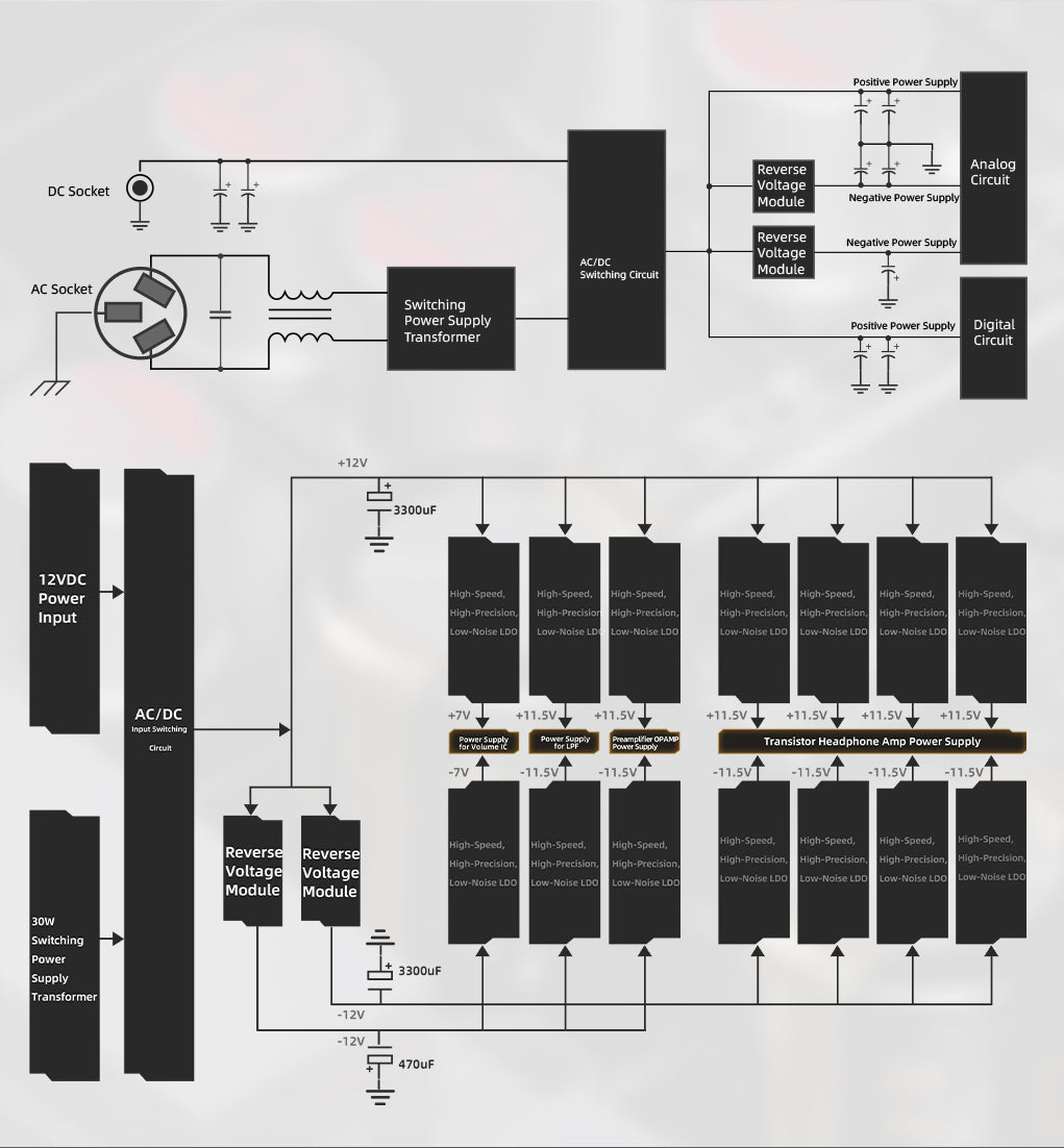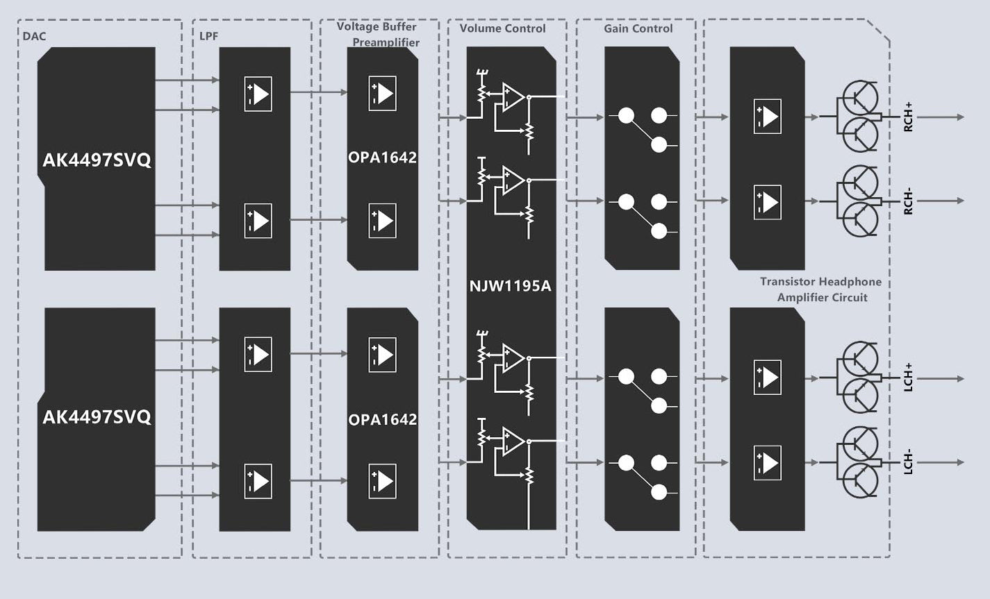 - Discrete Class-AB transistor current-boosting headphone amplifier circuit