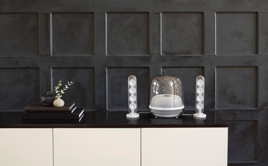 Harman Kardon SoundSticks 4 make a statement in any contemporary home. The groundbreaking transparent dome design and sleek silhouette blend in seamlessly with your decor. The two satellite speakers and subwoofer cover look stunning with an inner rippled surface design reflecting the beauty of music.