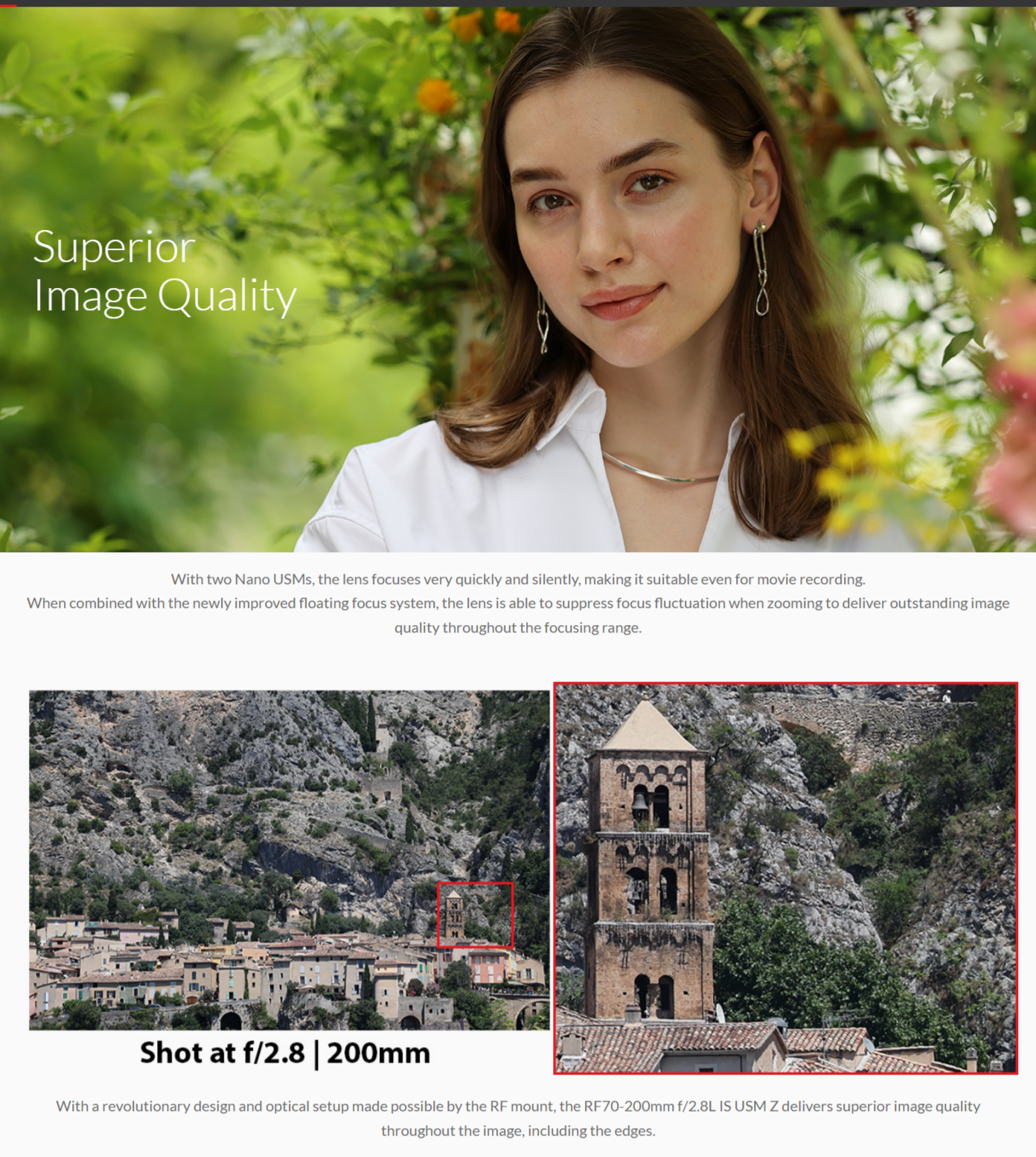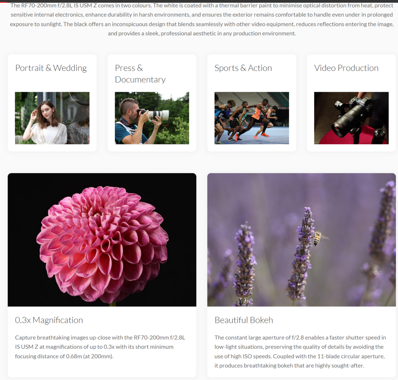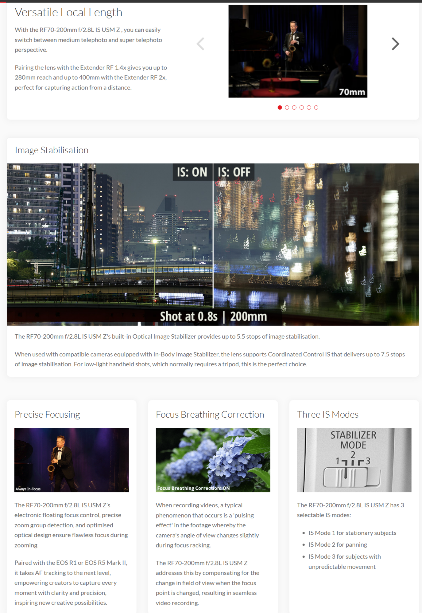 The RF70-200mm f/2.8L IS USM Z stands out as a telephoto zoom with iris control for precise creative expression. Featuring a wide f/2.8 aperture and an 11-blade circular design, it produces beautifully cinematic bokeh that elevates your filmmaking. In addition, it offers up to 7.5 stops of image stabilisation when paired with compatible cameras, delivering stability that rivals tripod-mounted shots for sharp and smooth handheld filming.