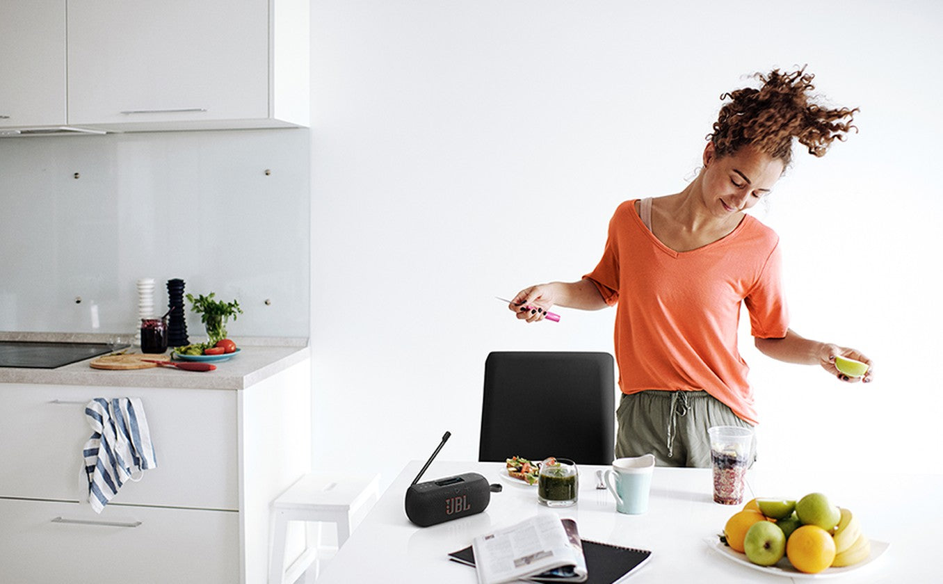 Tune into the fun and dive into an engaging new radio experience. Our powerful, portable JBL Tuner 3 radio keeps us locked into our favorite DAB/DAB+/FM radio stations and Bluetooth streaming, delivering bold, crystal clear JBL Pro Sound in the kitchen, by the pool, at the campsite, or wherever the mood takes us. We know it's going to elevate your listening. Get ready to crank up the volume. We've boosted the driver power, so the handy JBL Tuner 3 is loud enough to fill any space with pristine, true-to-life sound. It's our most powerful radio yet. Preset your six favorite stations so they're always at your fingertips. We also like to just explore the airwaves to see what surprises turn up on the big, clear LCD display. Either way, you get up to 15 hours of listening with Playtime Boost before you need a charge. Carry it anywhere, indoors or out, using the sturdy loop. Whether you're listening at the bathroom sink or on a white sand beach, the waterproof and dustproof design can handle just about anything. Find your own new station with the JBL Tuner 3.