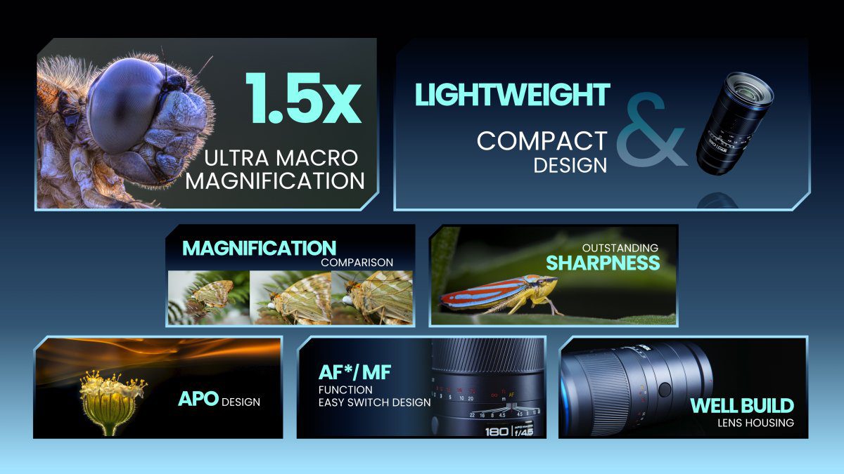Laowa’s first tele-macro lens, 180mm f/4.5 1.5X Ultra Macro APO, is designed to revolutionize telephoto, macro, and portrait photography. Combining a 1.5X ultra macro magnification, advanced apochromatic (APO) optics, a remarkably compact and lightweight design, and versatile functionality, this lens empowers photographers to capture intricate details with unparalleled clarity in both close-up subjects and distant scenes. With its robust lens build and innovative features, including autofocus on selective mount options, it’s a handy yet powerful tool for professionals and enthusiasts alike.