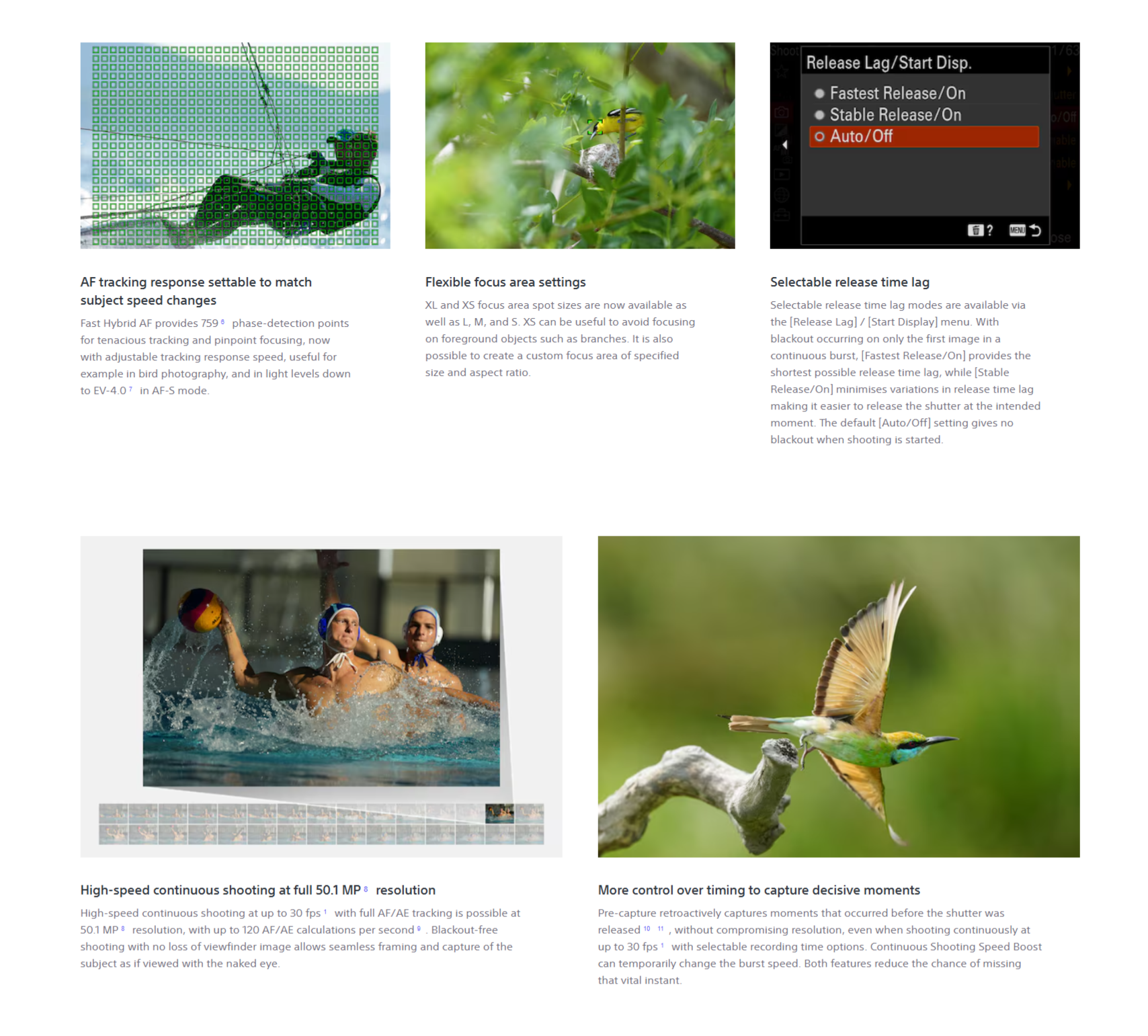 The massive volume of data from the approximately 50.1 effective megapixel full frame Exmor RS™ image sensor is processed in real time by Sony’s BIONZ XR™ image processing engine. An advanced AI processing unit applies high-level subject recognition to reliably recognise a wide range of subjects. These state-of-the-art technologies come together to make it easy to capture even the most challenging subjects in extraordinary resolution, with blackout-free viewing and full AF/AE tracking performance at up to 30 fps.