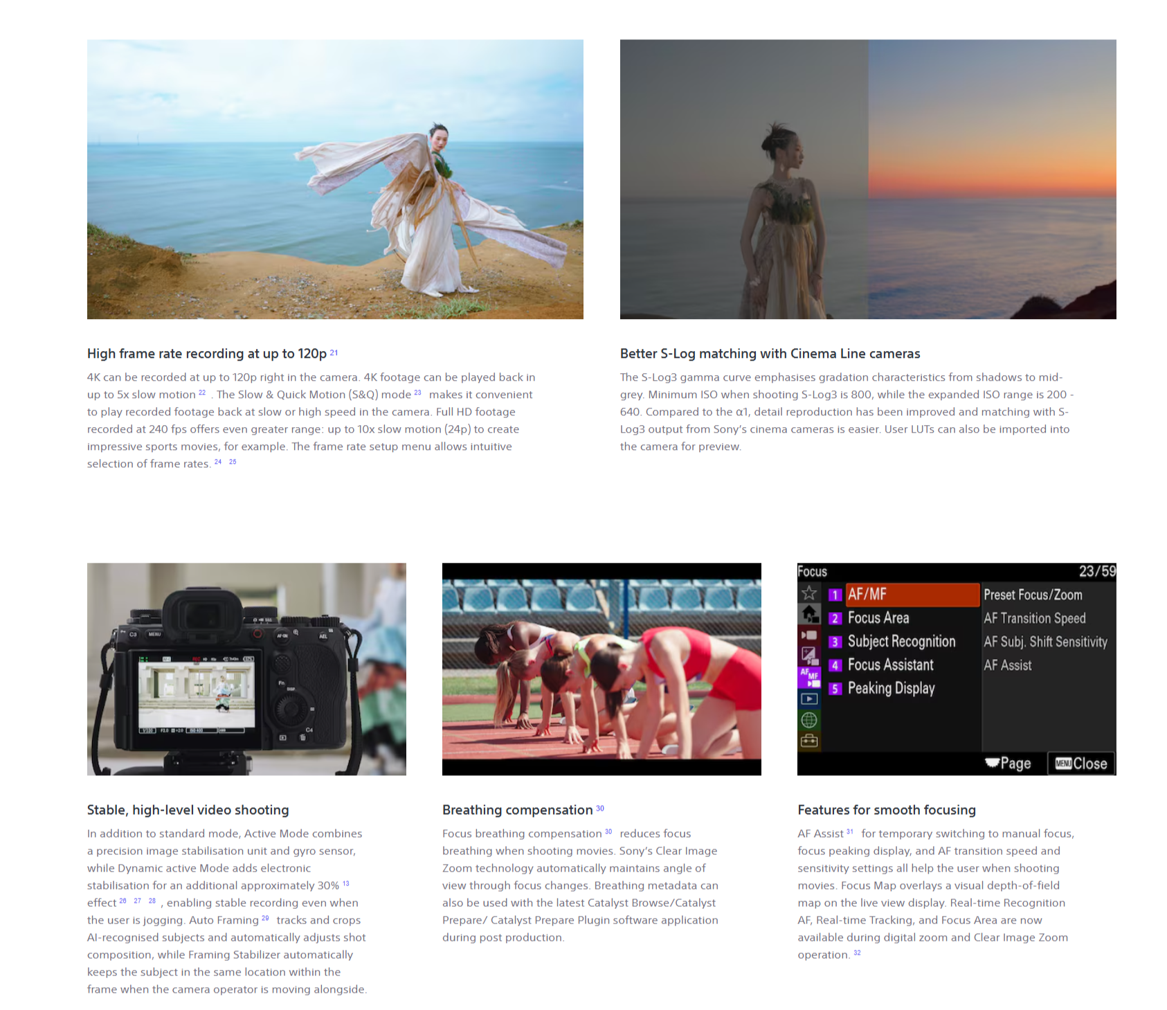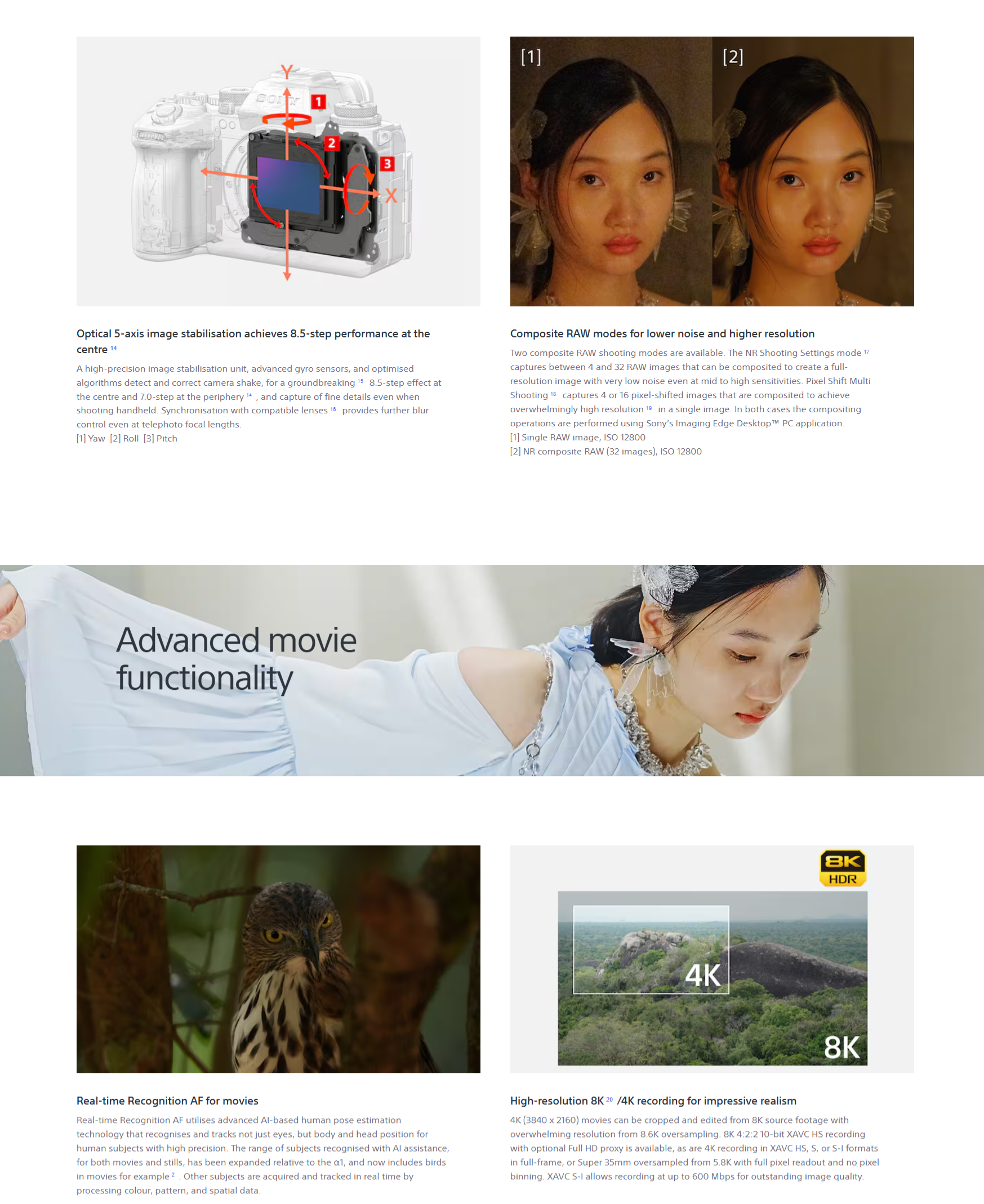 Real-time Recognition AF utilises advanced AI-based human pose estimation technology that recognises and tracks not just eyes, but body and head position for human subjects with high precision. The range of subjects recognised with AI assistance, for both movies and stills, has been expanded relative to the α1, and now includes birds in movies for example2. Other subjects are acquired and tracked in real time by processing colour, pattern, and spatial data.