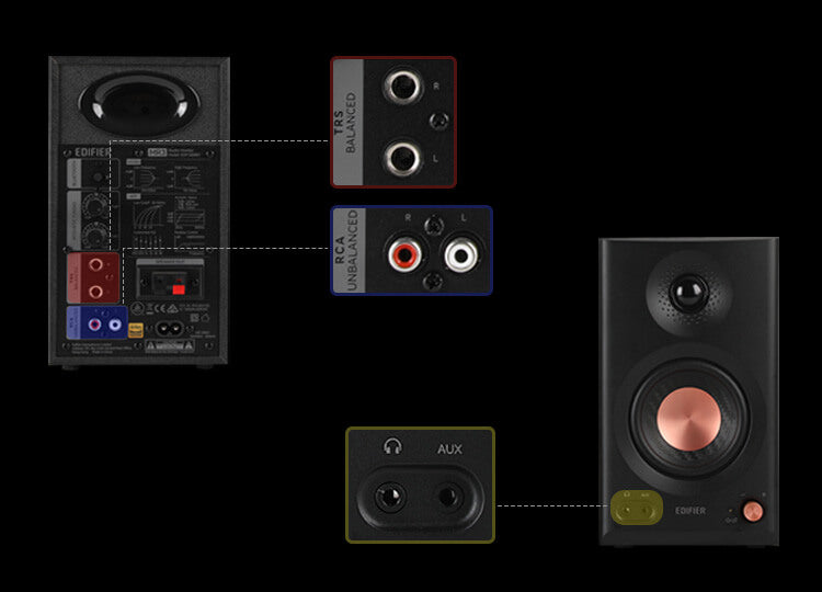 - Balanced TRS, RCA, and AUX inputs, with a headphone output socket
