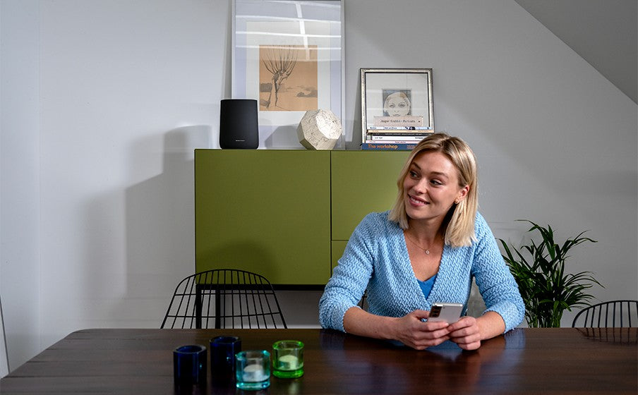 The stylish Harman Kardon Enchant Wireless Speaker lets you forget the world around you, surrounding you with the music you love thanks to its up-firing drivers and Dolby Atmos® Music. You can place it anywhere in the room and the compact speaker will automatically calibrate itself to deliver spacious, room-filling sound. Since it works seamlessly with AirPlay, Chromecast built-in™, and Spotify Connect, you can enjoy the immersive experience of Dolby Atmos® Music no matter where you create your playlists. And the quality of the Enchant Wireless Speaker audio is matched by its sleek, minimalist design—crafted in part with recycled materials—which looks great in any space.