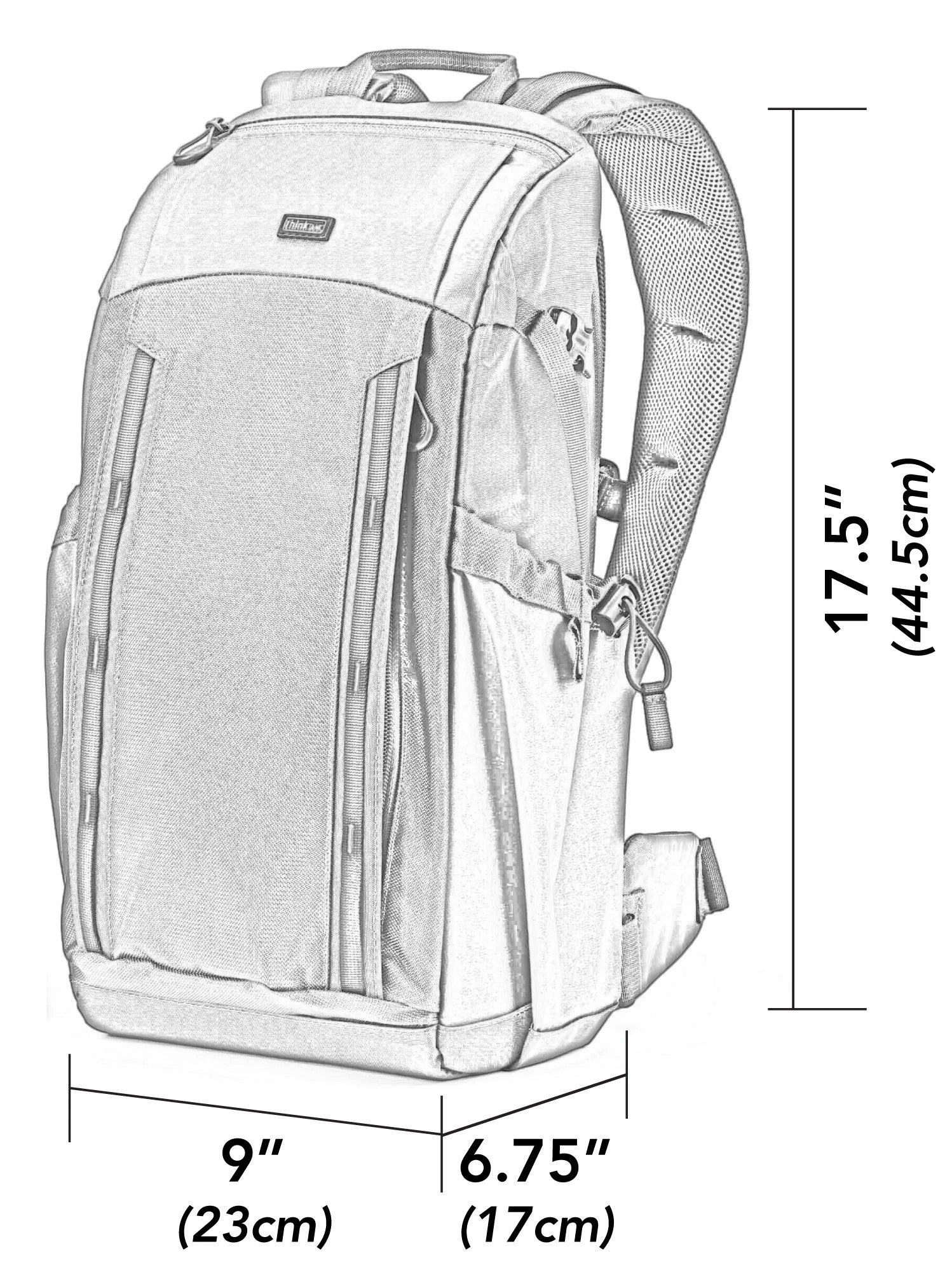 Despite its slim profile, the pack will hold a standard-sized camera body and the trifecta of zoom lenses. A minimal but plush harness systems provides comfortable, all-day carry and two large side pockets each fit a 32 oz Nalgene water bottle or can be used to carry a tripod.