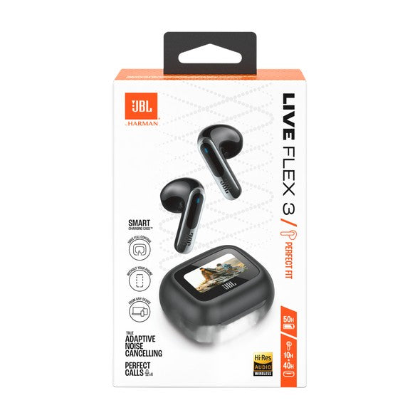Get customized sound without even looking at your phone. Use the controls on the Smart Charging Case™ of the JBL Live Flex 3 true wireless noise-cancelling open-stick earbuds with Hi-Res Audio to customize all their features without opening the JBL app on your device. Adjust volume and EQ, control your music, take phone calls, see messages—you can even customize the screensaver with your favorite photos. And that’s before you get to enjoy the monumental JBL Signature Sound of the Live Flex 3 earbuds themselves. Best-in-class True Adaptive Noise Cancelling tunes out distractions. JBL Spatial Sound makes movies and music truly immersive. And if you have to take a call, 6 mics ensure perfect sound quality even in the noisiest surroundings. All this, plus a 50-hour charge: 10 hours in the buds* and another 40 in the case—and they can charge wirelessly. The charging case features a loop to attach a lanyard for even more convenience. Great sound has never been simpler. (*with ANC off)