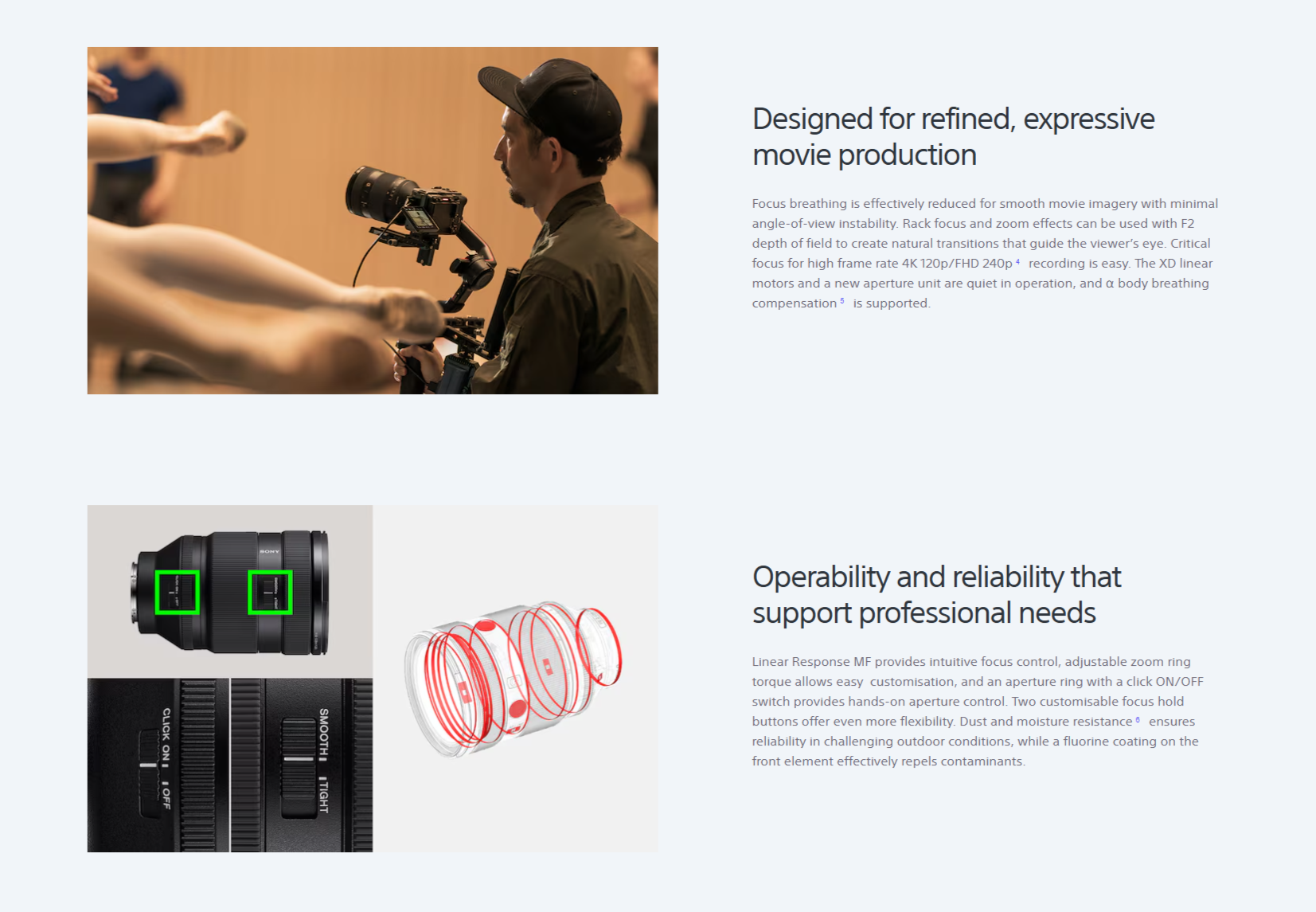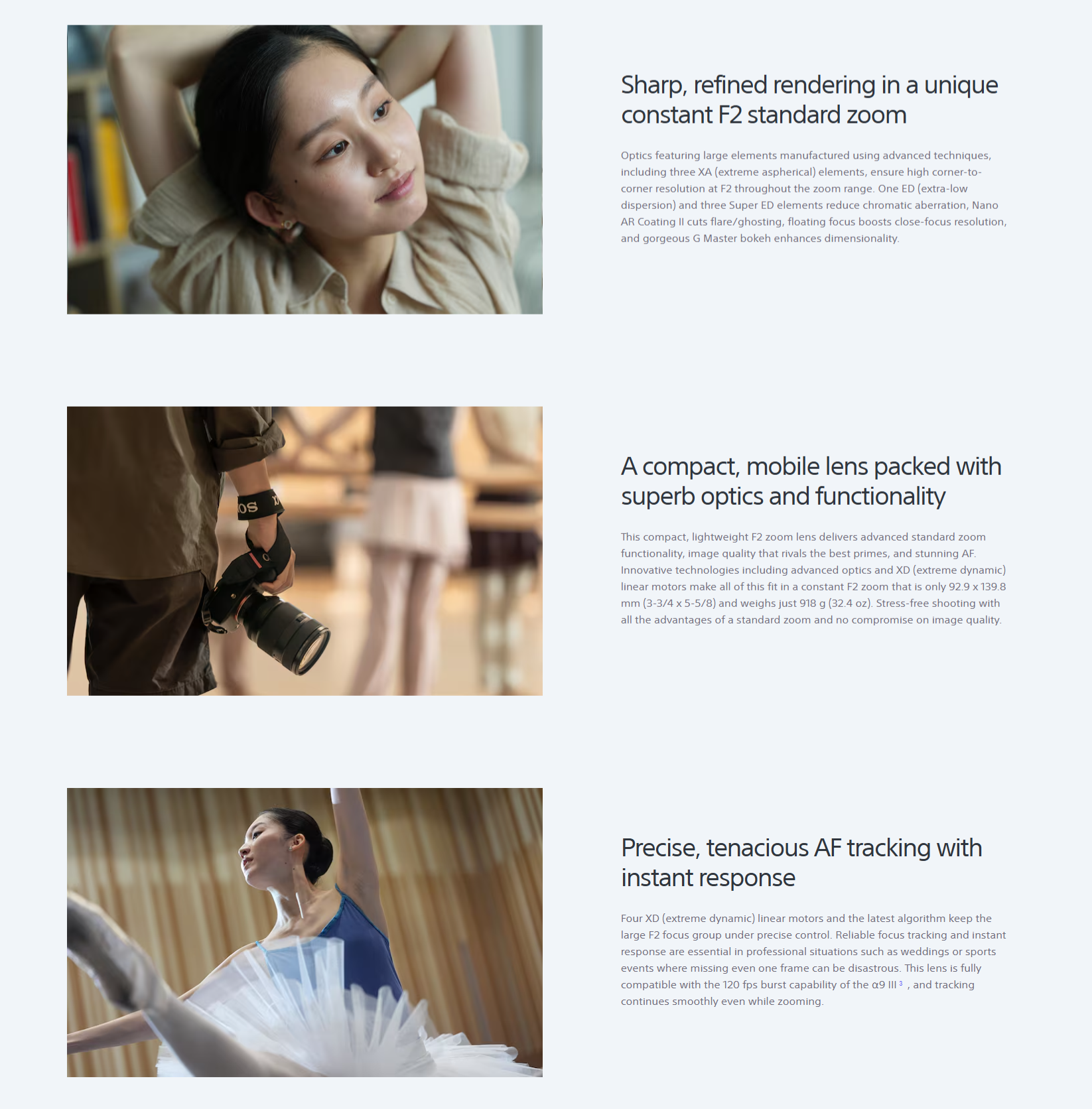 Sony’s first G Master™ standard zoom with constant F2 max. aperture is ideal for portraits and many other subjects. Its F2 aperture, superb optics, and mobility will appeal to even the most demanding pros. Sharpness and contrast rival prime lens quality, while brightness, unrivalled AF, zoom, and a compact, lightweight design offer extraordinary creative scope for stills and movies.