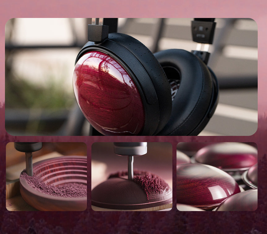 The headphone shells are crafted from Purpleheart wood, a species native to South America. To achieve their rich color, each piece of wood is allowed to naturally age for 90 days. Each wooden earcup features a unique grain and hue based on its individual characteristics, making every pair of headphones truly one-of-a-kind. The raw wood is the first precision-cut with CNC machining. To achieve a perfect finish, we then apply a high-gloss lacquer process, which involves repeatedly sanding, polishing, and filling the wood’s natural pores and imperfections until the surface is perfectly smooth. A final coat of high-gloss lacquer is then applied, allowing the wood’s unique, natural grain to shine through. With a density and hardness well beyond that of ordinary woods, Purpleheart wood is not only naturally resistant to corrosion but is also a huge contributor in minimizing resonance within the headphone earcups. This result is a faster and cleaner sound.