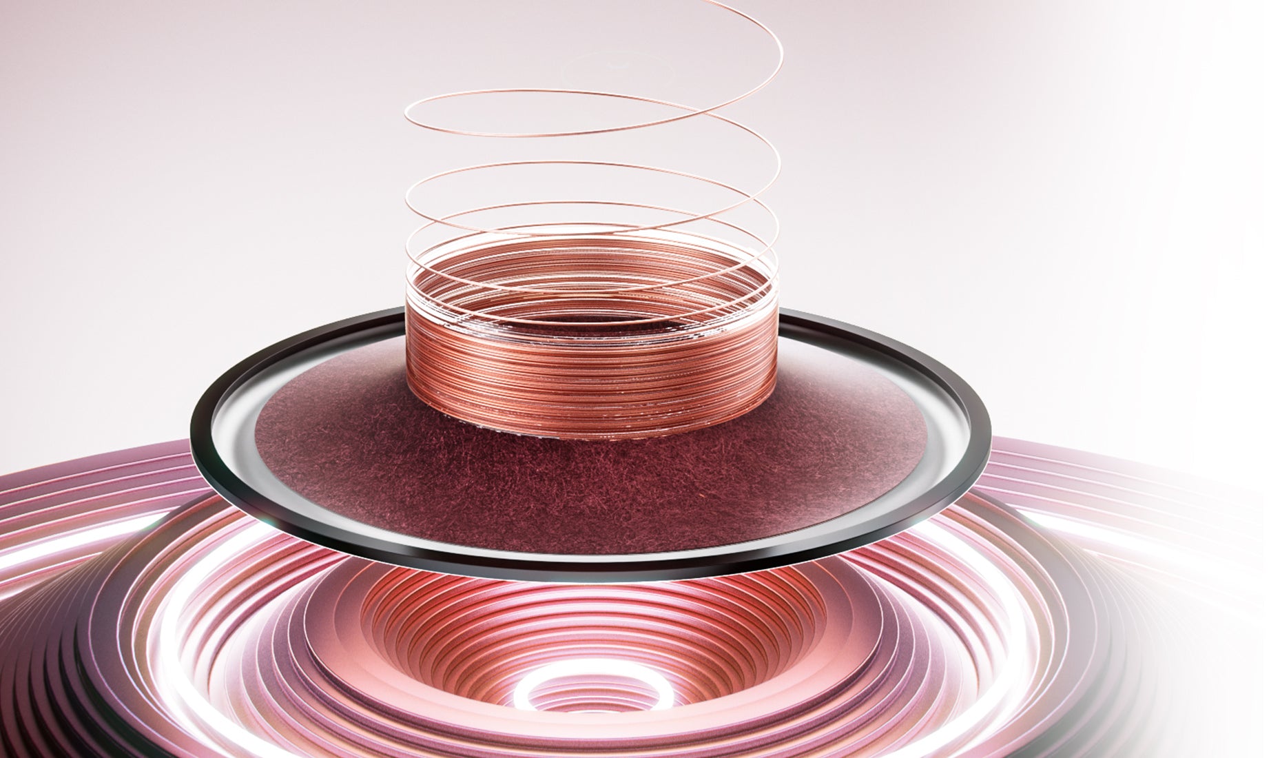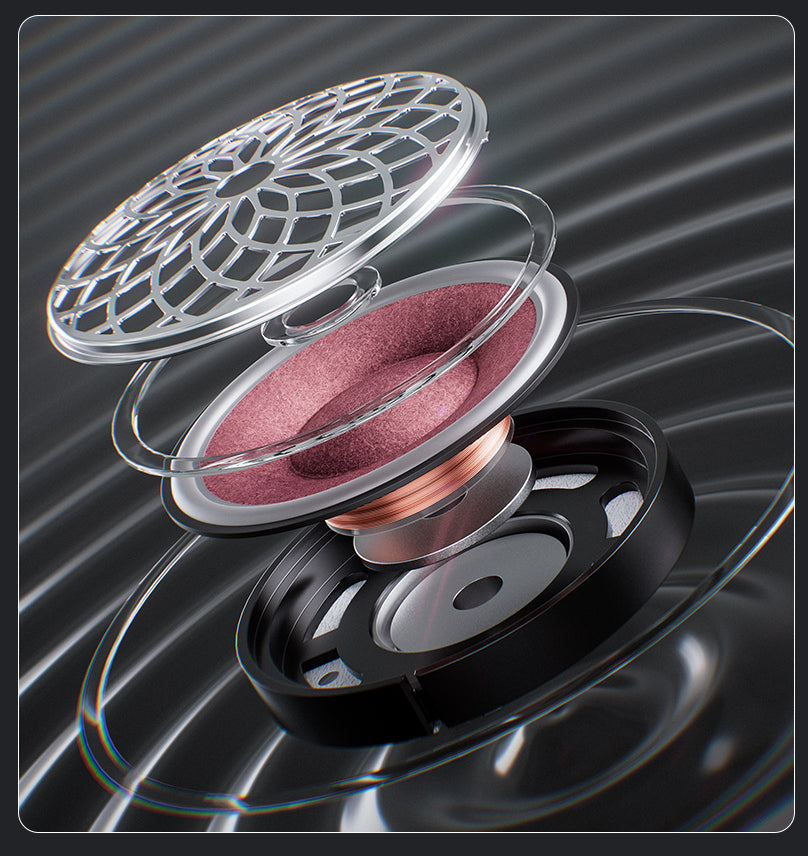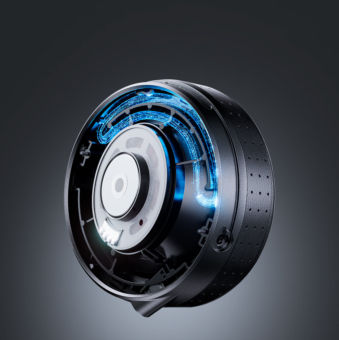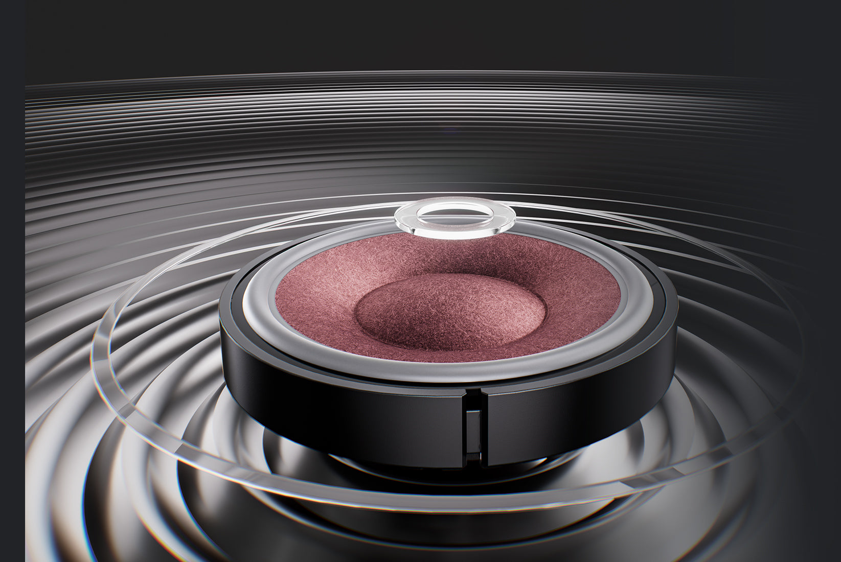 The headphone features a W-shaped diaphragm design inspired by speaker cones. Compared to the driver diaphragms typically found in headphones, this design increases the effective vibration area of the diaphragm by 25.8%. The diaphragm is made from a hard dome and a flexible surround. This rigid dome covers a larger surface area than traditional diaphragms, and since the voice coil drives it directly, there is less energy lost during vibration transfer. Compared to a more flexible material, the hard dome features reduced internal loss, resulting in higher efficiency and reduced distortion caused by driver breakup.