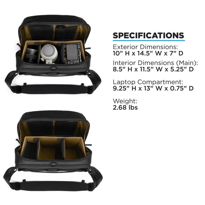 This camera messenger bag was designed for maximum comfort and features a padded shoulder strap that pivots so you can carry how you want it, whether that’s as a shoulder bag, cross body, or like a sling. The back of the sling has an EVA foam formed back panel and we’ve included a roller luggage pass-thru to give your shoulder a rest while traveling. On the front and bottom of the sling, there are external molle straps if you need to carry a tripod or jacket (strap sold separately). The dedicated laptop compartment can fit up to a 14” laptop.