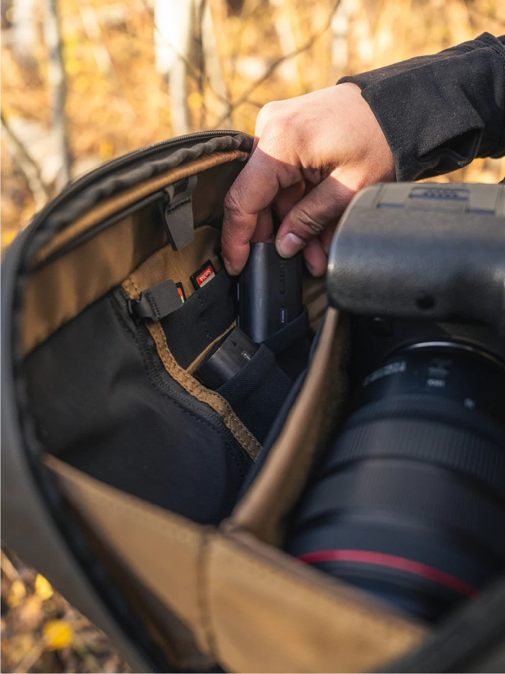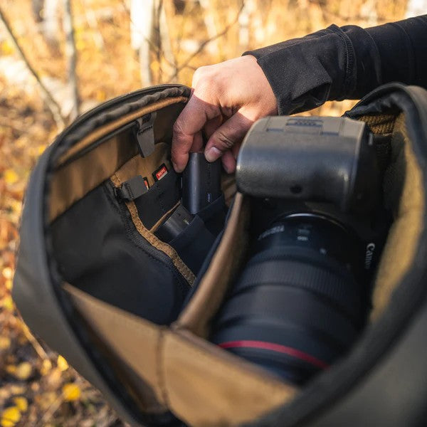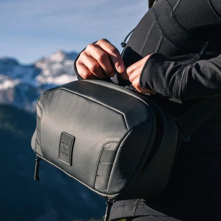 The McKinnon Camera Sling 5L is the perfect package for a light camera set up. Featuring one-handed quick access to your gear, this sling comfortably holds a camera body and a lens. Add in a seamless quick latch system, internal organizational pockets and external molle hooks to carry a tripod (straps sold separately). It’s slim enough to be worn as a hip pack or over your shoulder as a sling making this a compact quick-to-the-draw camera sling. We built the opening with a rigid wireframe construction for quick one-handed access and full visibility. The quick-latching system opens and closes easily and keeps your valuable gear secure.