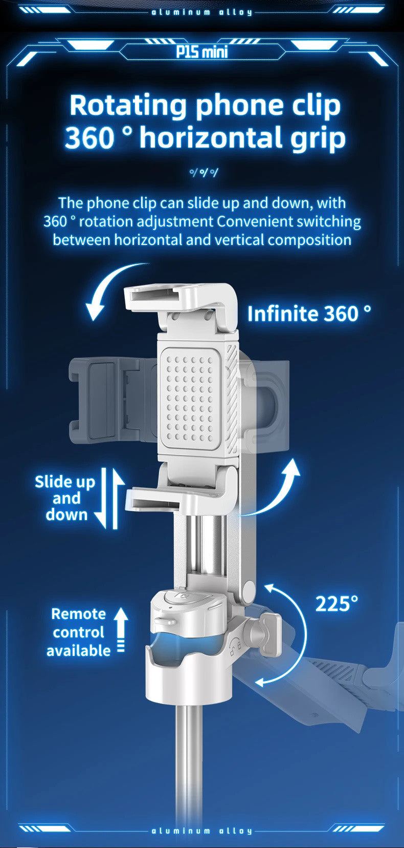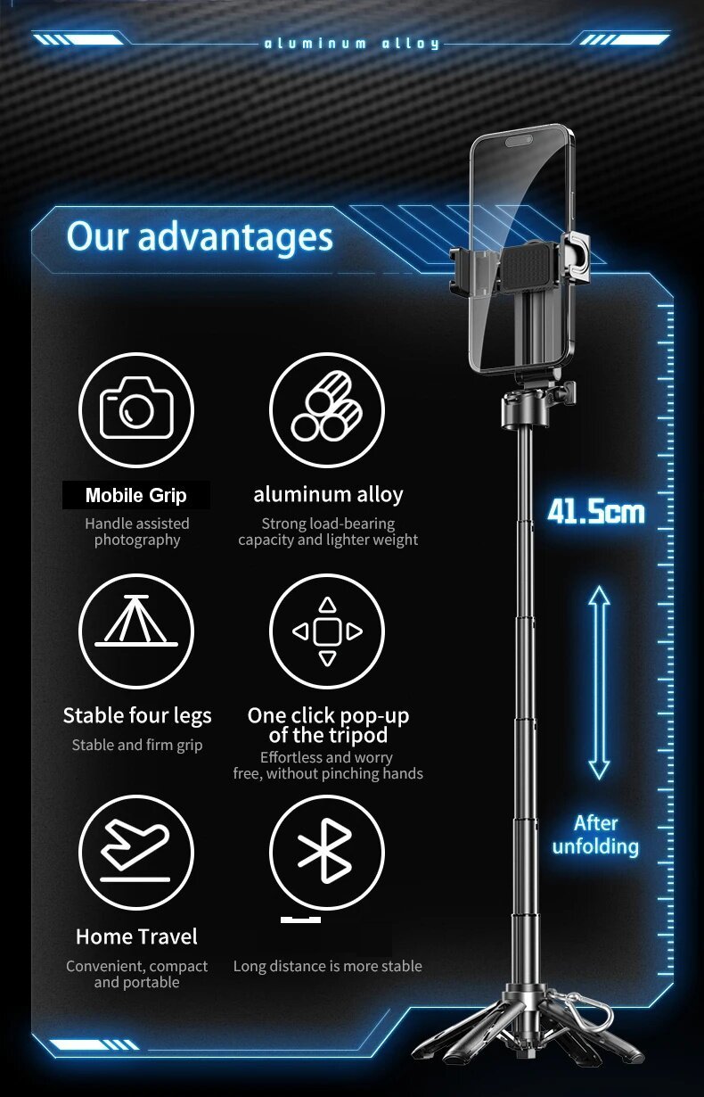 - Adjustable Heights & Angles: Adjust the 4-section pole and 360° swiveling phone mount for optimal framing.